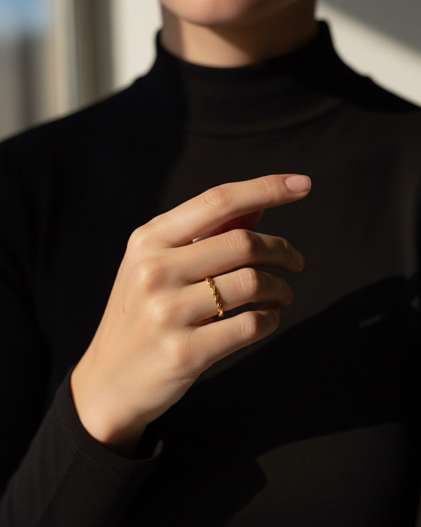Ein Symbol zeitloser Eleganz: Unser "Aura Solis" Ring aus echtem 14 Karat Gold strahlt im satten, warmen Farbton von 22 Karat Gold. Mit einem feinen Gewicht von 1,40 Gramm bietet dieser Ring ein zartes Tragegefühl. Perfekt für den täglichen Luxus oder als stilvolles Geschenk.